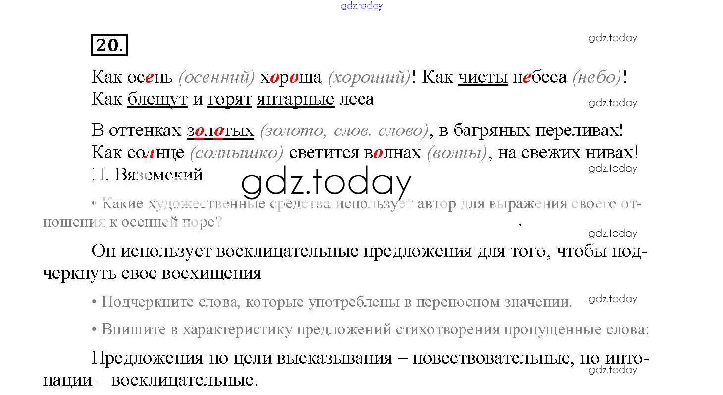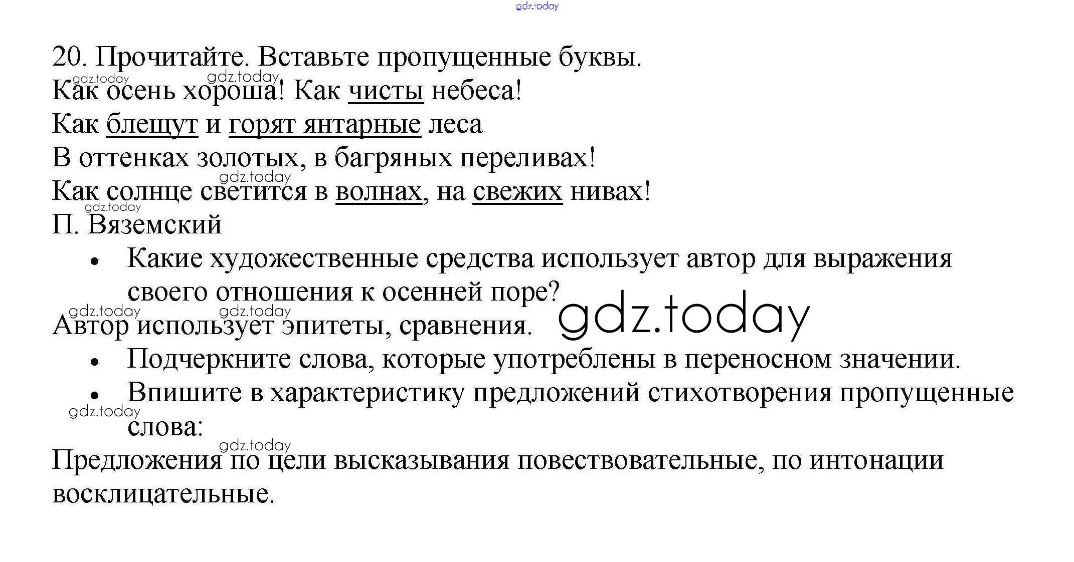 На страницах сайта gdz.today вы найдете учебный и вспомогательный материал, направленный на улучшения знаний школьной программы. ГДЗ - онлайн мир знаний Часть 1. Решение к заданиям 20 Рабочей тетради по Русскому языку для 4 класса Канакина Просвещение Школа России 2013