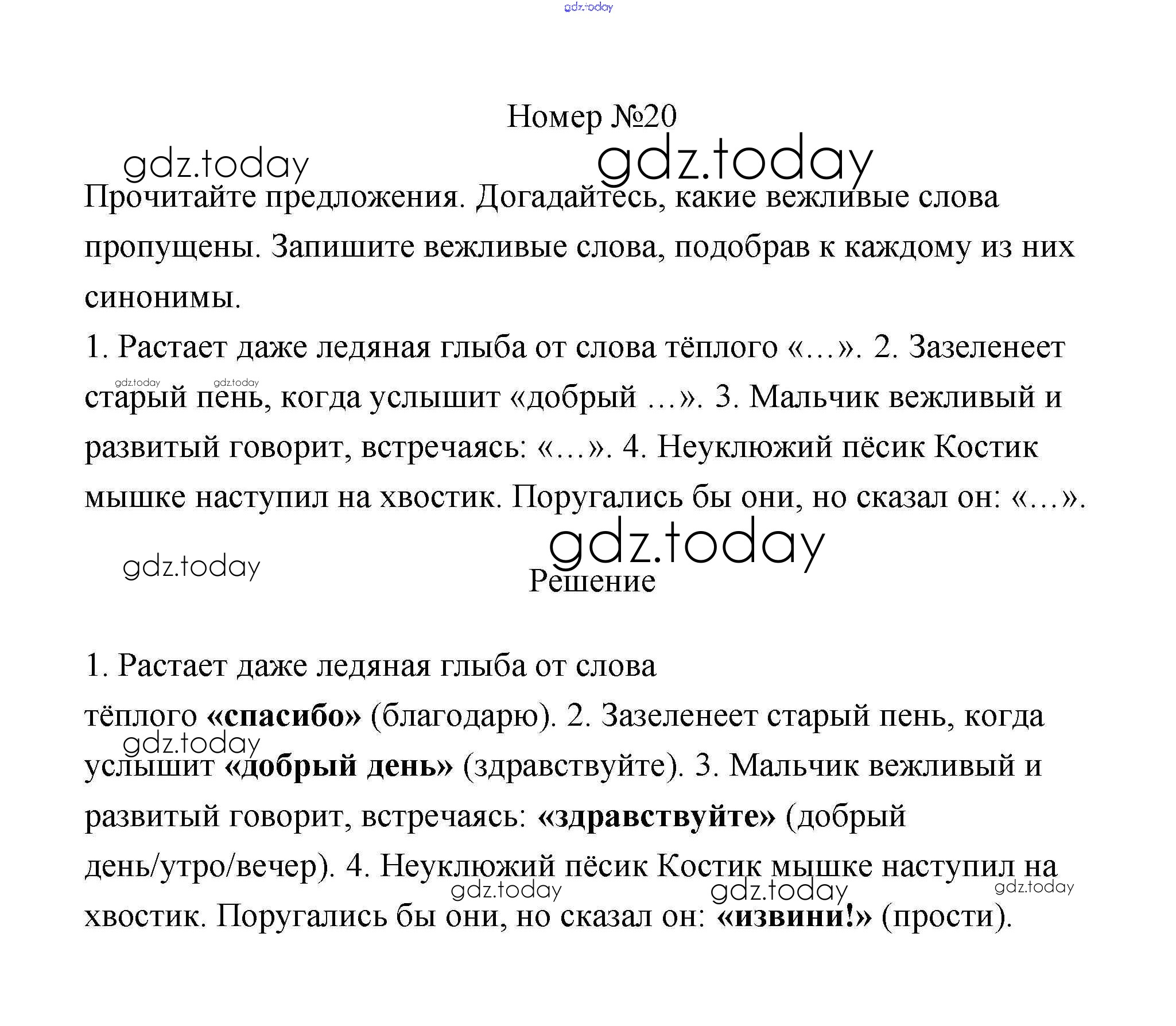 На страницах сайта gdz.today вы найдете учебный и вспомогательный материал, направленный на улучшения знаний школьной программы. ГДЗ - онлайн мир знаний Решение к части 1 20 Учебнику по Русскому языку для 4 класса Климанова, Бабушкина Просвещение Перспектива 2014
