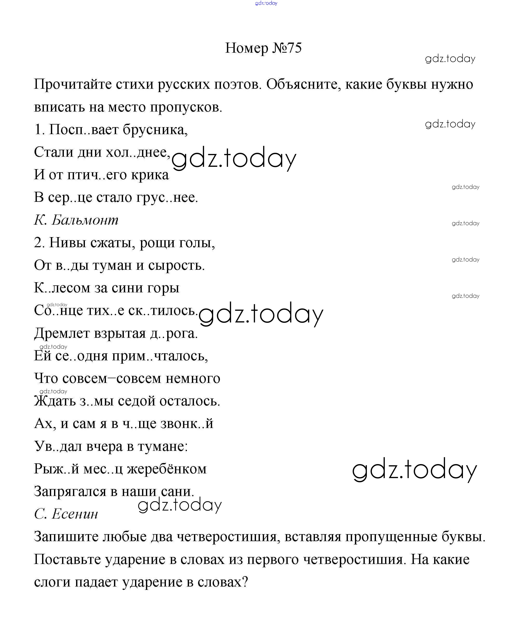 На страницах сайта gdz.today вы найдете учебный и вспомогательный материал, направленный на улучшения знаний школьной программы. ГДЗ - онлайн мир знаний Решение к части 1 75 Учебнику по Русскому языку для 4 класса Климанова, Бабушкина Просвещение Перспектива 2014