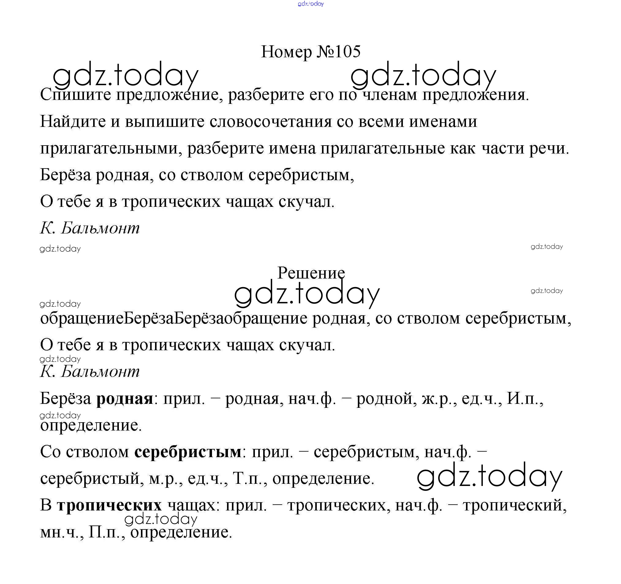 На страницах сайта gdz.today вы найдете учебный и вспомогательный материал, направленный на улучшения знаний школьной программы. ГДЗ - онлайн мир знаний Решение к части 2 105 Учебнику по Русскому языку для 4 класса Климанова, Бабушкина Просвещение Перспектива 2014