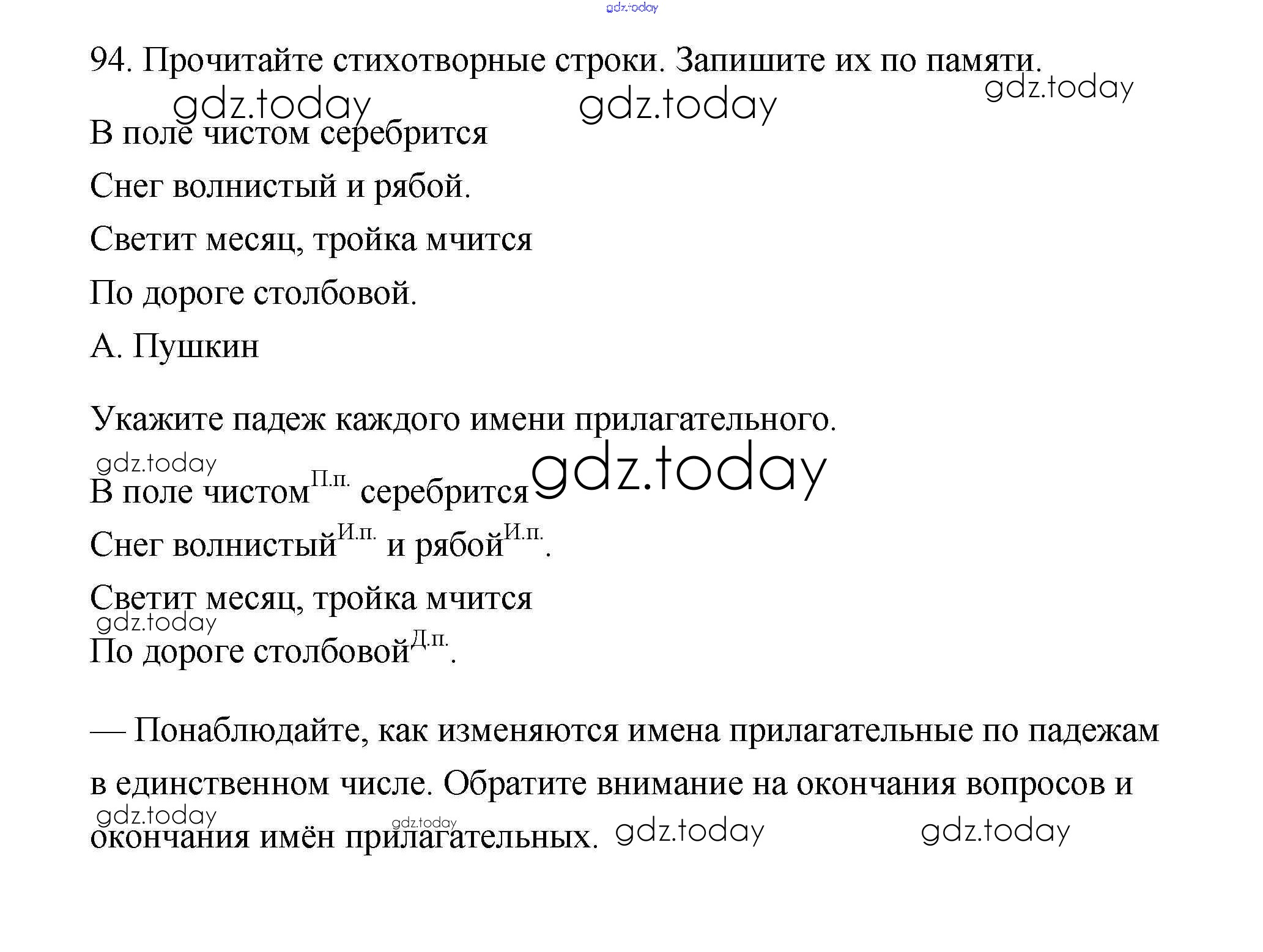На страницах сайта gdz.today вы найдете учебный и вспомогательный материал, направленный на улучшения знаний школьной программы. ГДЗ - онлайн мир знаний Решение к части 2 94 Учебнику по Русскому языку для 4 класса Климанова, Бабушкина Просвещение Перспектива 2014