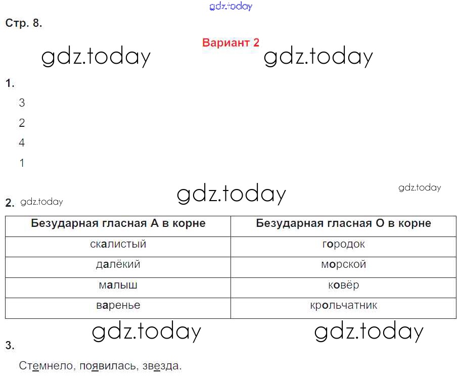 На страницах сайта gdz.today вы найдете учебный и вспомогательный материал, направленный на улучшения знаний школьной программы. ГДЗ - онлайн мир знаний Решение к части 2. Страницы 8 Контрольным работам по Русскому языку для 4 класса Крылова Экзамен УМК 2015