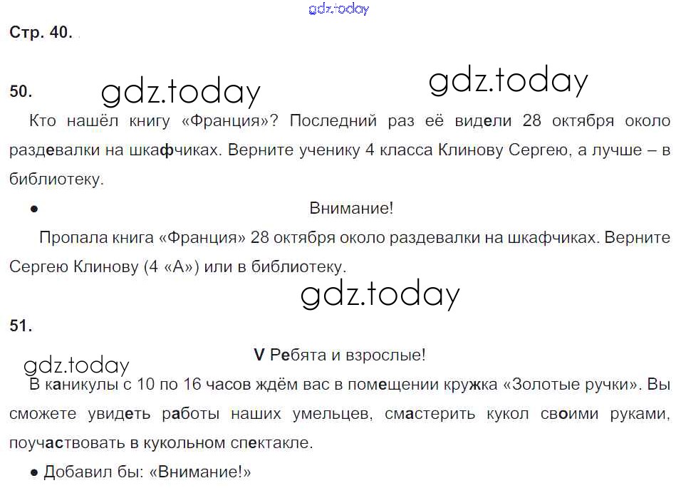 На страницах сайта gdz.today вы найдете учебный и вспомогательный материал, направленный на улучшения знаний школьной программы. ГДЗ - онлайн мир знаний Решение к части 1. Страницы 40 Тетради для самостоятельной работы по Русскому языку для 4 класса Корешкова Ассоциация 21 век Гармония 2019