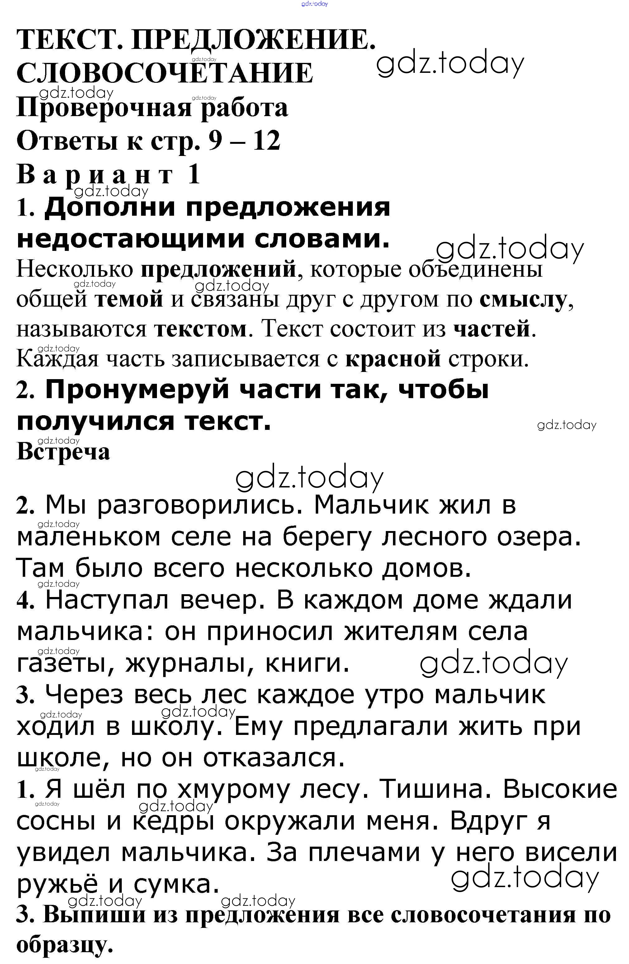 На страницах сайта gdz.today вы найдете учебный и вспомогательный материал, направленный на улучшения знаний школьной программы. ГДЗ - онлайн мир знаний Решение к теме "Текст. Предложение. Словосочетание" Проверочная работа стр. 9 – 12 Проверочным и контрольным работам по Русскому языку для 4 класса Максимова ВАКО 2017
