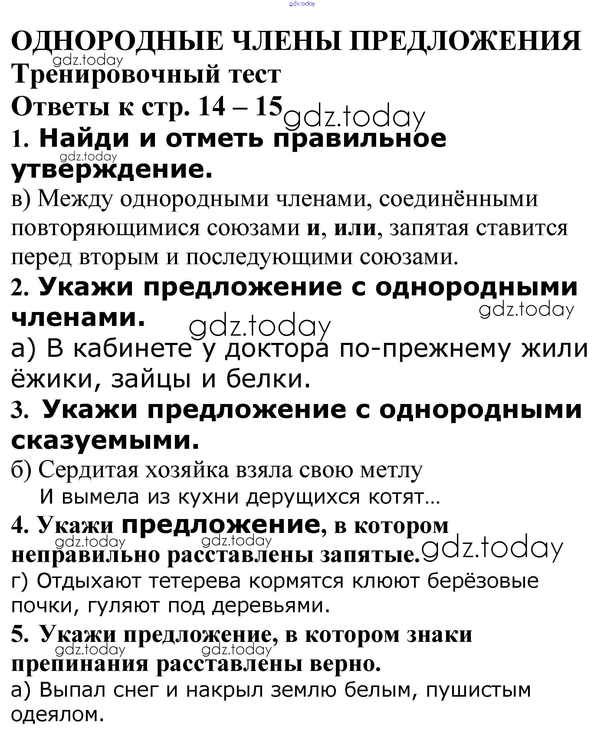 На страницах сайта gdz.today вы найдете учебный и вспомогательный материал, направленный на улучшения знаний школьной программы. ГДЗ - онлайн мир знаний Решение к теме "Однородные члены предложения" Тренировочный тест стр. 14 – 15 Проверочным и контрольным работам по Русскому языку для 4 класса Максимова ВАКО 2017