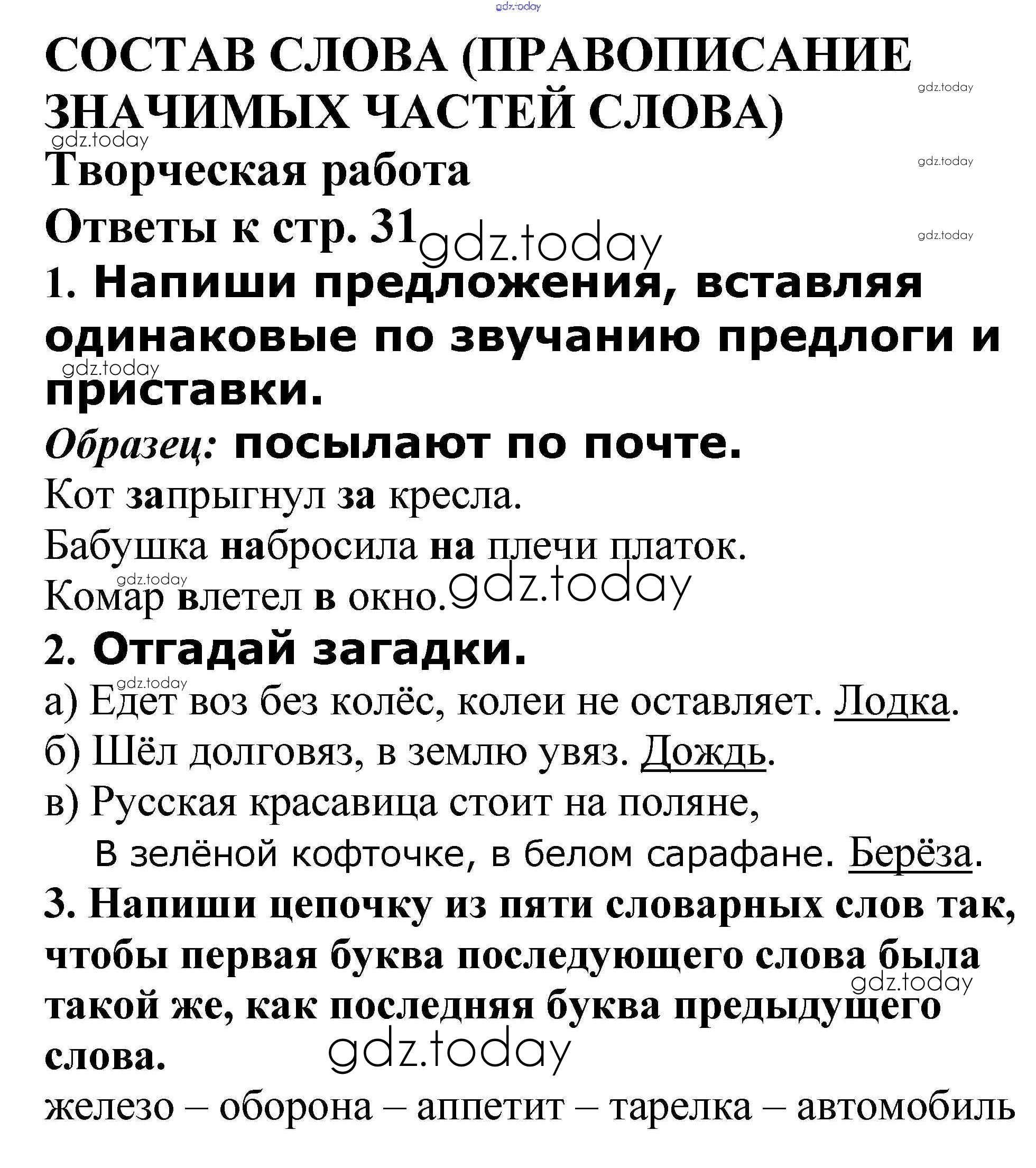 На страницах сайта gdz.today вы найдете учебный и вспомогательный материал, направленный на улучшения знаний школьной программы. ГДЗ - онлайн мир знаний Решение к теме "Состав слова (правописание значимых частей слова)" Творческая работа стр. 31 Проверочным и контрольным работам по Русскому языку для 4 класса Максимова ВАКО 2017