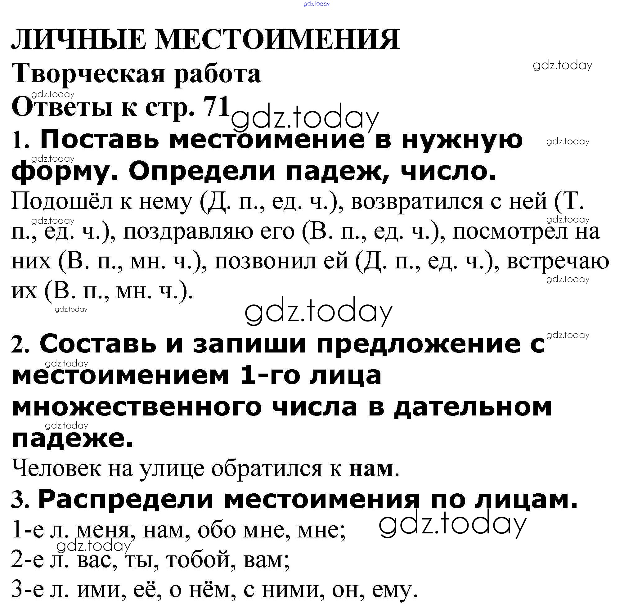 На страницах сайта gdz.today вы найдете учебный и вспомогательный материал, направленный на улучшения знаний школьной программы. ГДЗ - онлайн мир знаний Решение к теме "Личные местоимения" Творческая работа стр. 71 Проверочным и контрольным работам по Русскому языку для 4 класса Максимова ВАКО 2017