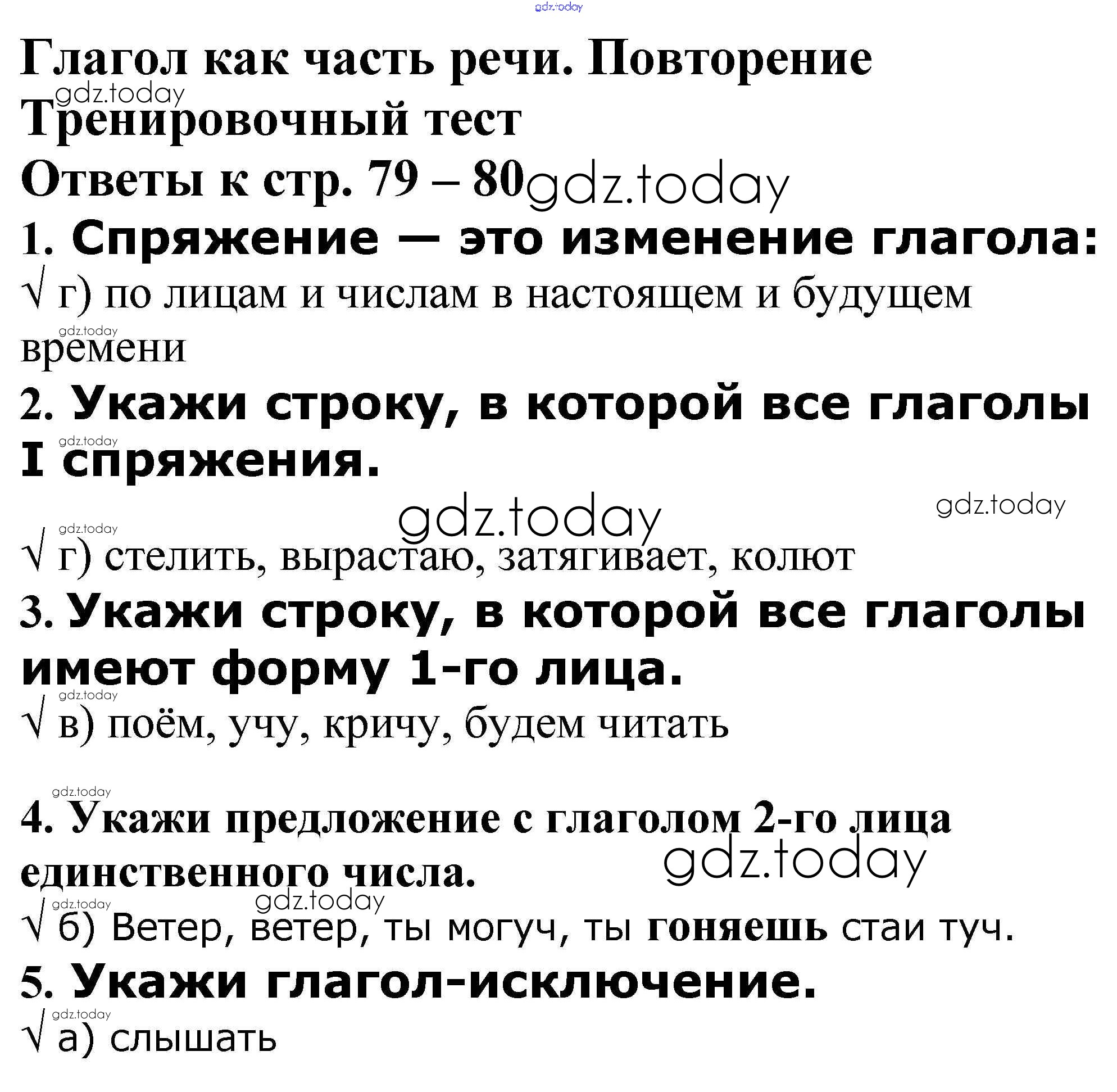 На страницах сайта gdz.today вы найдете учебный и вспомогательный материал, направленный на улучшения знаний школьной программы. ГДЗ - онлайн мир знаний Решение к теме "Спряжение глаголов" Тренировочный тест стр. 79 – 80 Проверочным и контрольным работам по Русскому языку для 4 класса Максимова ВАКО 2017