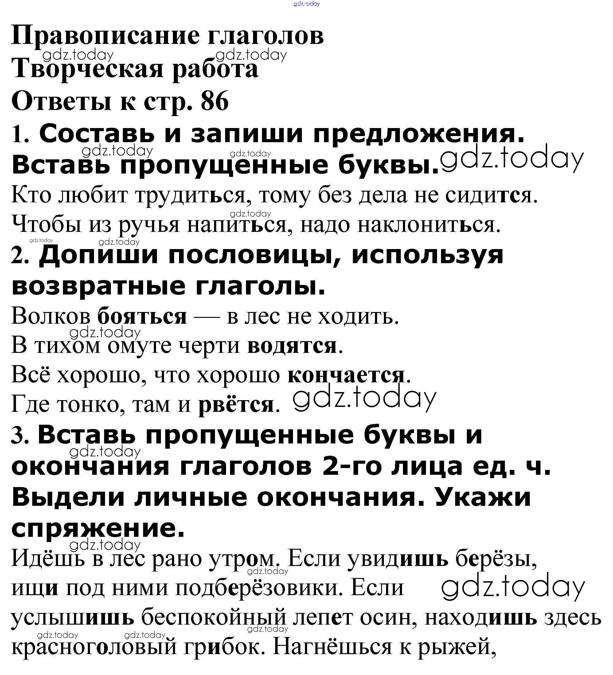 На страницах сайта gdz.today вы найдете учебный и вспомогательный материал, направленный на улучшения знаний школьной программы. ГДЗ - онлайн мир знаний Решение к теме "Правописание глаголов" Творческая работа стр. 86 Проверочным и контрольным работам по Русскому языку для 4 класса Максимова ВАКО 2017