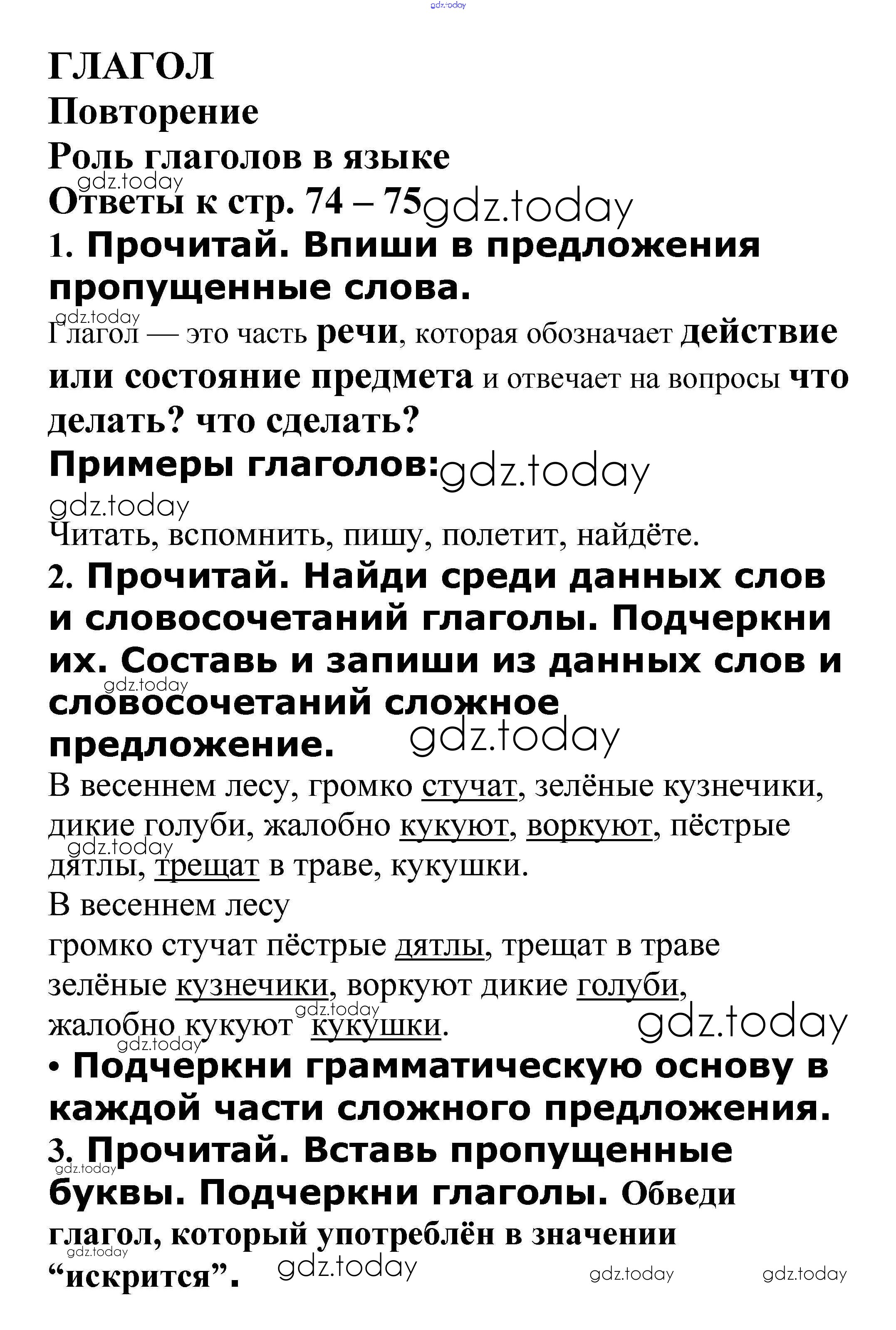 На страницах сайта gdz.today вы найдете учебный и вспомогательный материал, направленный на улучшения знаний школьной программы. ГДЗ - онлайн мир знаний Решение к теме "Глагол" стр. 74 – 75 Проверочным работам по Русскому языку для 4 класса Канакина Просвещение Школа России 2017