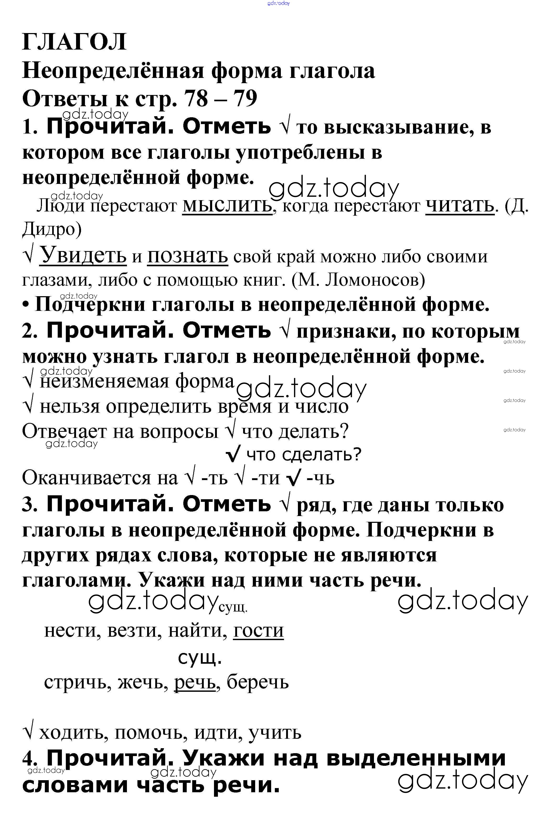 На страницах сайта gdz.today вы найдете учебный и вспомогательный материал, направленный на улучшения знаний школьной программы. ГДЗ - онлайн мир знаний Решение к теме "Глагол" стр. 78 – 79 Проверочным работам по Русскому языку для 4 класса Канакина Просвещение Школа России 2017