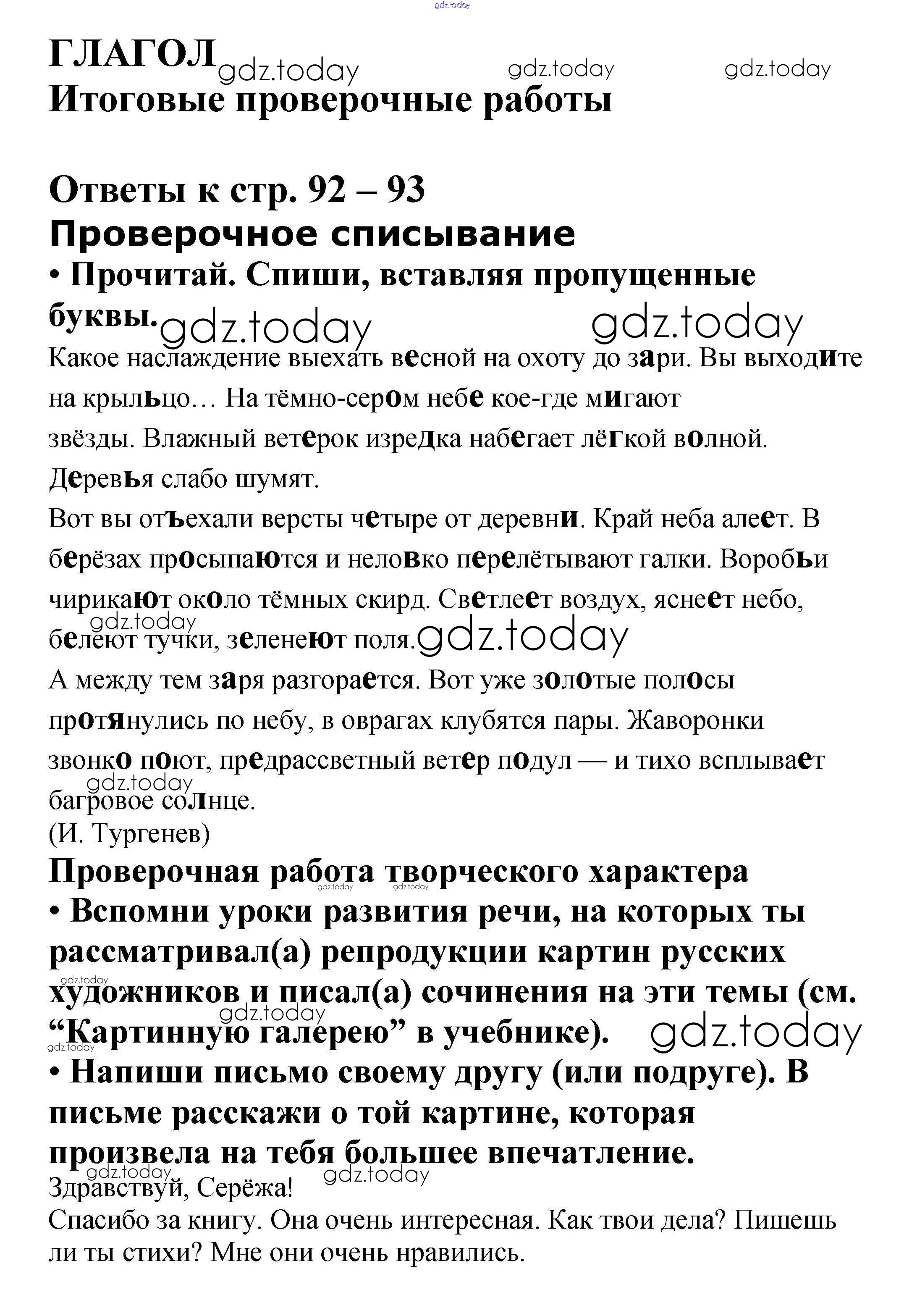 На страницах сайта gdz.today вы найдете учебный и вспомогательный материал, направленный на улучшения знаний школьной программы. ГДЗ - онлайн мир знаний Решение к теме "Глагол" стр. 92 – 93 Проверочным работам по Русскому языку для 4 класса Канакина Просвещение Школа России 2017