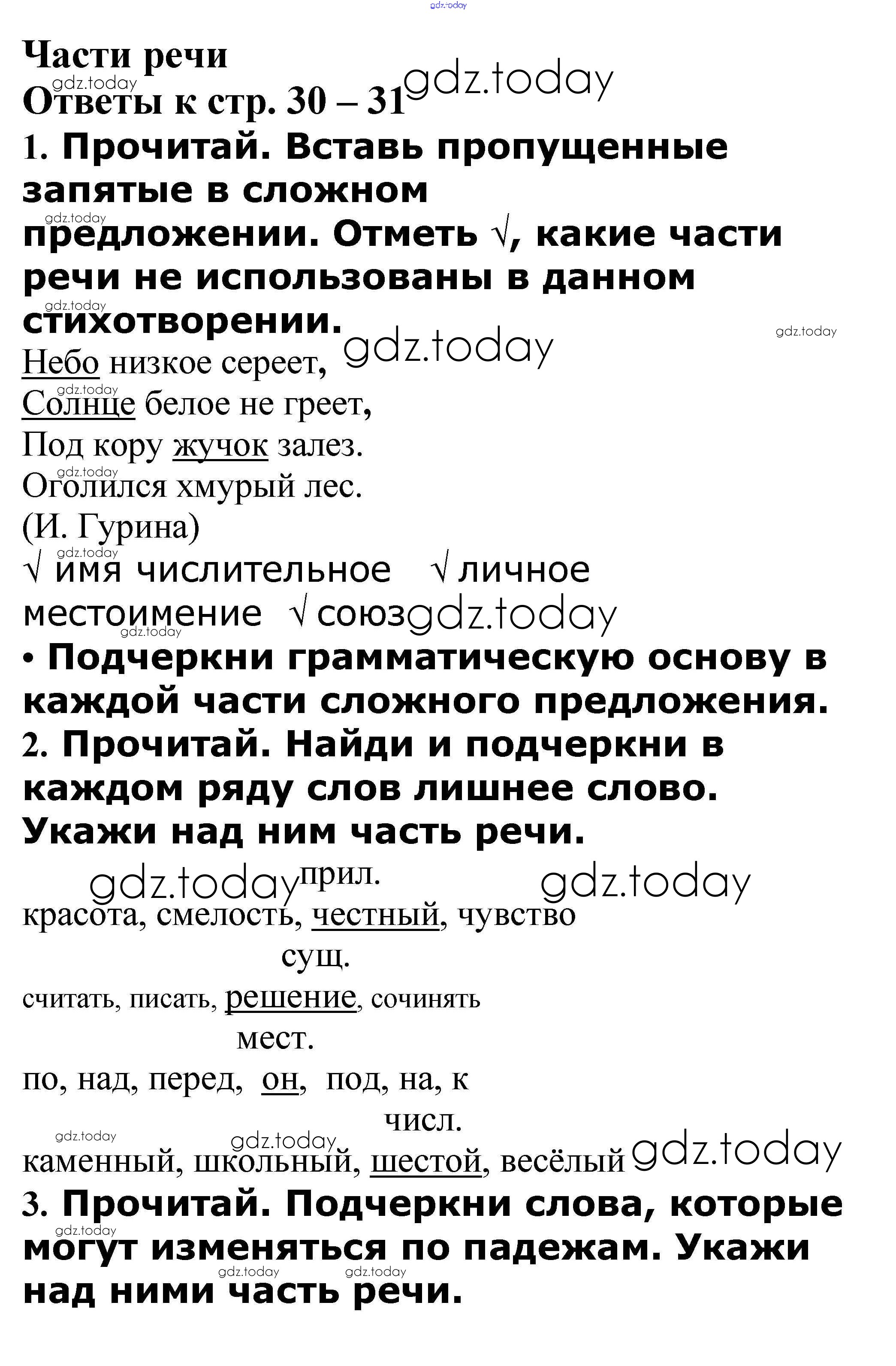 На страницах сайта gdz.today вы найдете учебный и вспомогательный материал, направленный на улучшения знаний школьной программы. ГДЗ - онлайн мир знаний Решение к теме "Части речи" стр. 30 – 31 Проверочным работам по Русскому языку для 4 класса Канакина Просвещение Школа России 2017