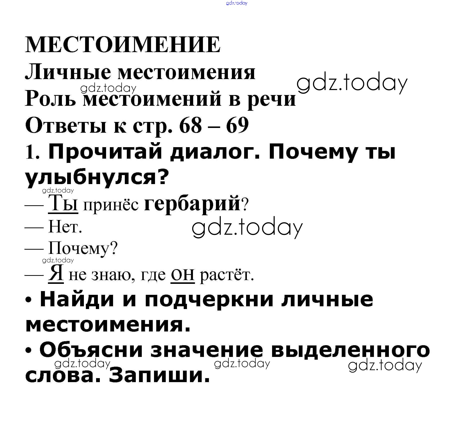 На страницах сайта gdz.today вы найдете учебный и вспомогательный материал, направленный на улучшения знаний школьной программы. ГДЗ - онлайн мир знаний Решение к теме "Личные местоимения" стр. 68 – 69 Проверочным работам по Русскому языку для 4 класса Канакина Просвещение Школа России 2017