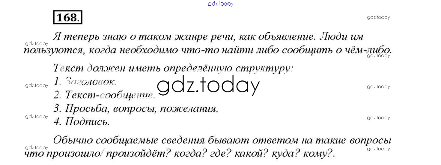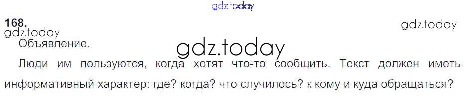 На страницах сайта gdz.today вы найдете учебный и вспомогательный материал, направленный на улучшения знаний школьной программы. ГДЗ - онлайн мир знаний Решение к части 1. Упражнения 168 Учебнику по Русскому языку для 4 класса Соловейчик, Кузьменко Ассоциация 21 век Гармония 2015