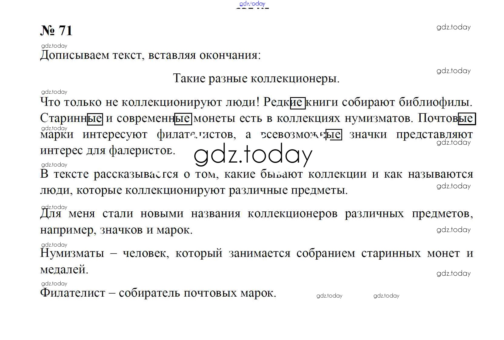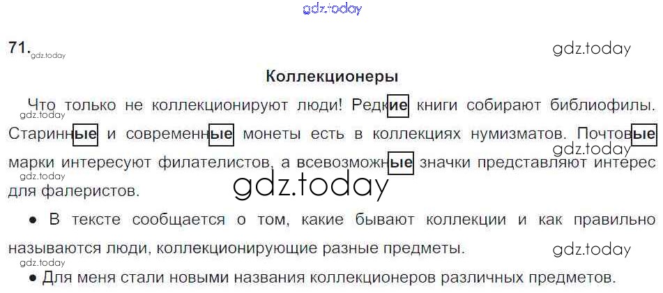 На страницах сайта gdz.today вы найдете учебный и вспомогательный материал, направленный на улучшения знаний школьной программы. ГДЗ - онлайн мир знаний Решение к части 2. (упражнения) 71 Тетради для упражнений по Русскому языку для 4 класса Рамзаева, Свинкина Дрофа 2013