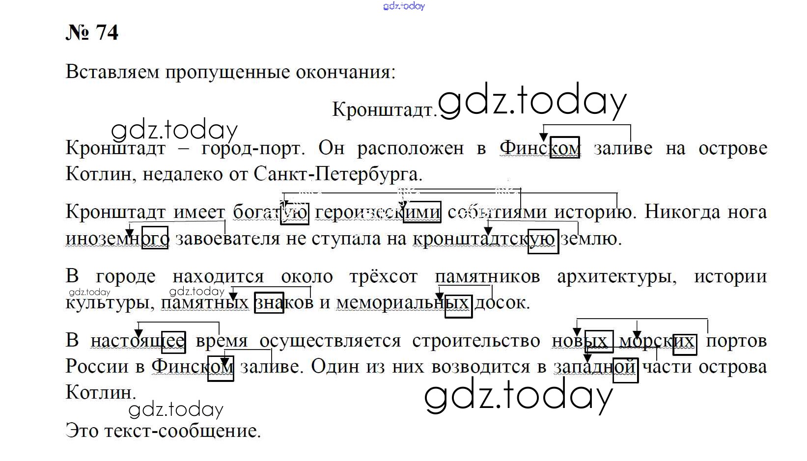 На страницах сайта gdz.today вы найдете учебный и вспомогательный материал, направленный на улучшения знаний школьной программы. ГДЗ - онлайн мир знаний Решение к части 2. (упражнения) 74 Тетради для упражнений по Русскому языку для 4 класса Рамзаева, Свинкина Дрофа 2013