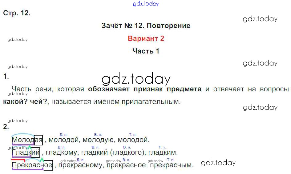 На страницах сайта gdz.today вы найдете учебный и вспомогательный материал, направленный на улучшения знаний школьной программы. ГДЗ - онлайн мир знаний Решение к части 2. Страницы 12 Зачётным работам по Русскому языку для 4 класса Алимпиева, Векшина Экзамен УМК 2016