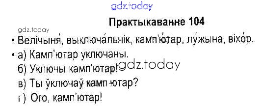 На страницах сайта gdz.today вы найдете учебный и вспомогательный материал, направленный на улучшения знаний школьной программы. ГДЗ - онлайн мир знаний Рашальнік да часткі 1. Практыкаванні 104 Учебнику по Белорусскому языку для 5 класса Красней, Несцяровіч Национальный институт образования 2014