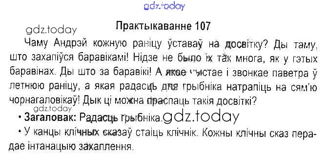 На страницах сайта gdz.today вы найдете учебный и вспомогательный материал, направленный на улучшения знаний школьной программы. ГДЗ - онлайн мир знаний Рашальнік да часткі 1. Практыкаванні 107 Учебнику по Белорусскому языку для 5 класса Красней, Несцяровіч Национальный институт образования 2014