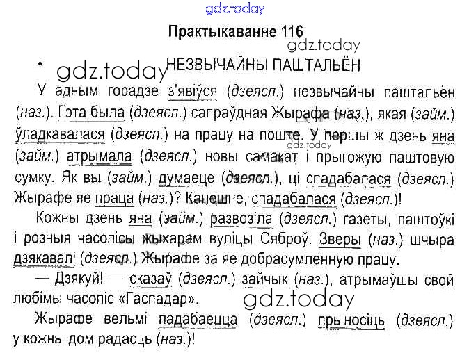 На страницах сайта gdz.today вы найдете учебный и вспомогательный материал, направленный на улучшения знаний школьной программы. ГДЗ - онлайн мир знаний Рашальнік да часткі 1. Практыкаванні 116 Учебнику по Белорусскому языку для 5 класса Красней, Несцяровіч Национальный институт образования 2014