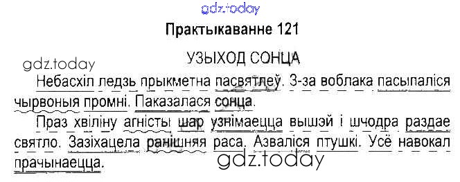 На страницах сайта gdz.today вы найдете учебный и вспомогательный материал, направленный на улучшения знаний школьной программы. ГДЗ - онлайн мир знаний Рашальнік да часткі 1. Практыкаванні 121 Учебнику по Белорусскому языку для 5 класса Красней, Несцяровіч Национальный институт образования 2014