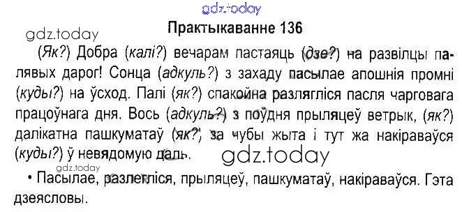 На страницах сайта gdz.today вы найдете учебный и вспомогательный материал, направленный на улучшения знаний школьной программы. ГДЗ - онлайн мир знаний Рашальнік да часткі 1. Практыкаванні 136 Учебнику по Белорусскому языку для 5 класса Красней, Несцяровіч Национальный институт образования 2014
