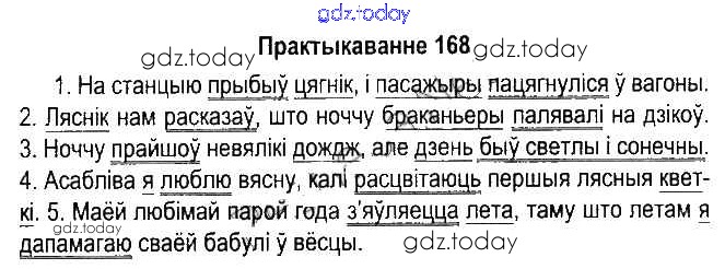 На страницах сайта gdz.today вы найдете учебный и вспомогательный материал, направленный на улучшения знаний школьной программы. ГДЗ - онлайн мир знаний Рашальнік да часткі 1. Практыкаванні 168 Учебнику по Белорусскому языку для 5 класса Красней, Несцяровіч Национальный институт образования 2014