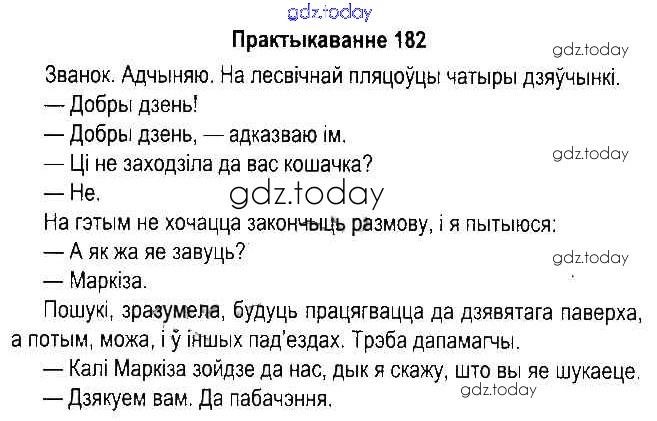 На страницах сайта gdz.today вы найдете учебный и вспомогательный материал, направленный на улучшения знаний школьной программы. ГДЗ - онлайн мир знаний Рашальнік да часткі 1. Практыкаванні 182 Учебнику по Белорусскому языку для 5 класса Красней, Несцяровіч Национальный институт образования 2014
