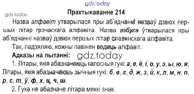 На страницах сайта gdz.today вы найдете учебный и вспомогательный материал, направленный на улучшения знаний школьной программы. ГДЗ - онлайн мир знаний Рашальнік да часткі 1. Практыкаванні 214 Учебнику по Белорусскому языку для 5 класса Красней, Несцяровіч Национальный институт образования 2014