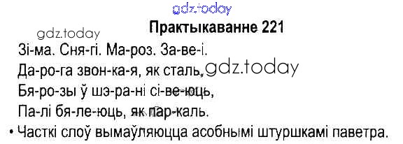 На страницах сайта gdz.today вы найдете учебный и вспомогательный материал, направленный на улучшения знаний школьной программы. ГДЗ - онлайн мир знаний Рашальнік да часткі 1. Практыкаванні 221 Учебнику по Белорусскому языку для 5 класса Красней, Несцяровіч Национальный институт образования 2014