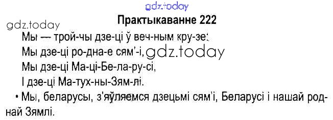 На страницах сайта gdz.today вы найдете учебный и вспомогательный материал, направленный на улучшения знаний школьной программы. ГДЗ - онлайн мир знаний Рашальнік да часткі 1. Практыкаванні 222 Учебнику по Белорусскому языку для 5 класса Красней, Несцяровіч Национальный институт образования 2014