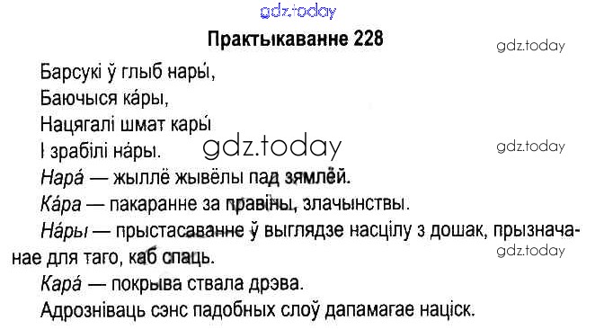 На страницах сайта gdz.today вы найдете учебный и вспомогательный материал, направленный на улучшения знаний школьной программы. ГДЗ - онлайн мир знаний Рашальнік да часткі 1. Практыкаванні 228 Учебнику по Белорусскому языку для 5 класса Красней, Несцяровіч Национальный институт образования 2014