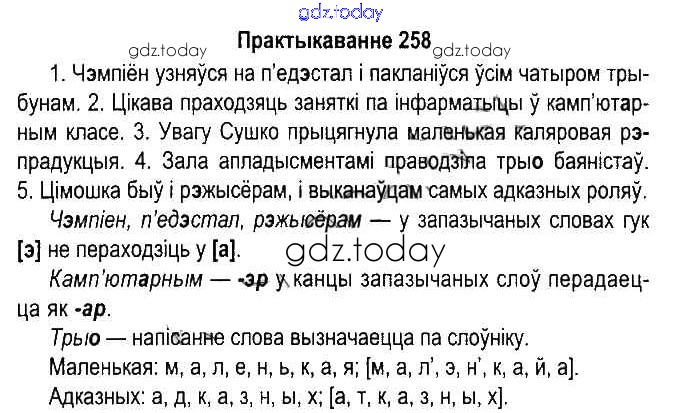 На страницах сайта gdz.today вы найдете учебный и вспомогательный материал, направленный на улучшения знаний школьной программы. ГДЗ - онлайн мир знаний Рашальнік да часткі 1. Практыкаванні 258 Учебнику по Белорусскому языку для 5 класса Красней, Несцяровіч Национальный институт образования 2014