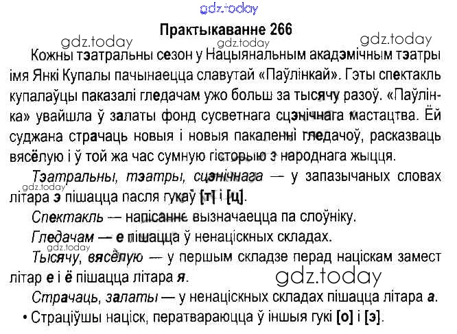 На страницах сайта gdz.today вы найдете учебный и вспомогательный материал, направленный на улучшения знаний школьной программы. ГДЗ - онлайн мир знаний Рашальнік да часткі 1. Практыкаванні 266 Учебнику по Белорусскому языку для 5 класса Красней, Несцяровіч Национальный институт образования 2014