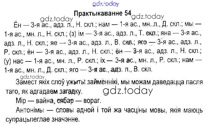 На страницах сайта gdz.today вы найдете учебный и вспомогательный материал, направленный на улучшения знаний школьной программы. ГДЗ - онлайн мир знаний Рашальнік да часткі 1. Практыкаванні 54 Учебнику по Белорусскому языку для 5 класса Красней, Несцяровіч Национальный институт образования 2014