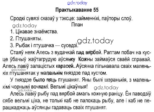 На страницах сайта gdz.today вы найдете учебный и вспомогательный материал, направленный на улучшения знаний школьной программы. ГДЗ - онлайн мир знаний Рашальнік да часткі 1. Практыкаванні 55 Учебнику по Белорусскому языку для 5 класса Красней, Несцяровіч Национальный институт образования 2014