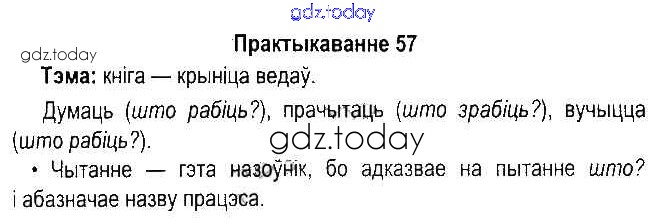 На страницах сайта gdz.today вы найдете учебный и вспомогательный материал, направленный на улучшения знаний школьной программы. ГДЗ - онлайн мир знаний Рашальнік да часткі 1. Практыкаванні 57 Учебнику по Белорусскому языку для 5 класса Красней, Несцяровіч Национальный институт образования 2014
