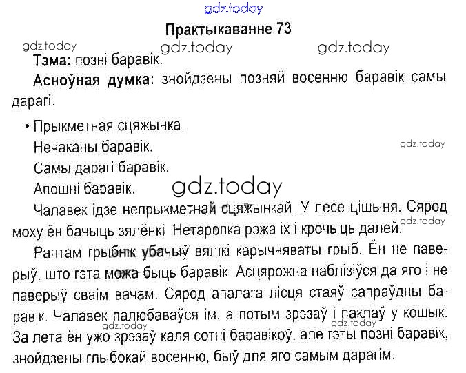 На страницах сайта gdz.today вы найдете учебный и вспомогательный материал, направленный на улучшения знаний школьной программы. ГДЗ - онлайн мир знаний Рашальнік да часткі 1. Практыкаванні 73 Учебнику по Белорусскому языку для 5 класса Красней, Несцяровіч Национальный институт образования 2014