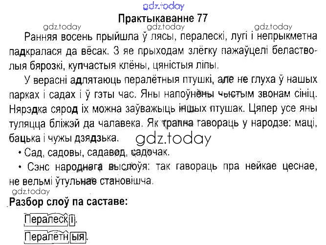 На страницах сайта gdz.today вы найдете учебный и вспомогательный материал, направленный на улучшения знаний школьной программы. ГДЗ - онлайн мир знаний Рашальнік да часткі 1. Практыкаванні 77 Учебнику по Белорусскому языку для 5 класса Красней, Несцяровіч Национальный институт образования 2014