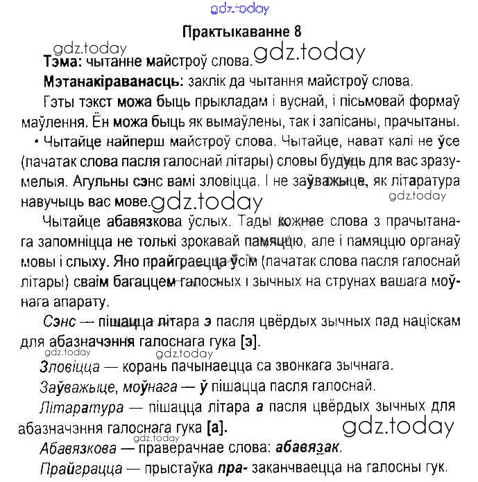 На страницах сайта gdz.today вы найдете учебный и вспомогательный материал, направленный на улучшения знаний школьной программы. ГДЗ - онлайн мир знаний Рашальнік да часткі 1. Практыкаванні 8 Учебнику по Белорусскому языку для 5 класса Красней, Несцяровіч Национальный институт образования 2014
