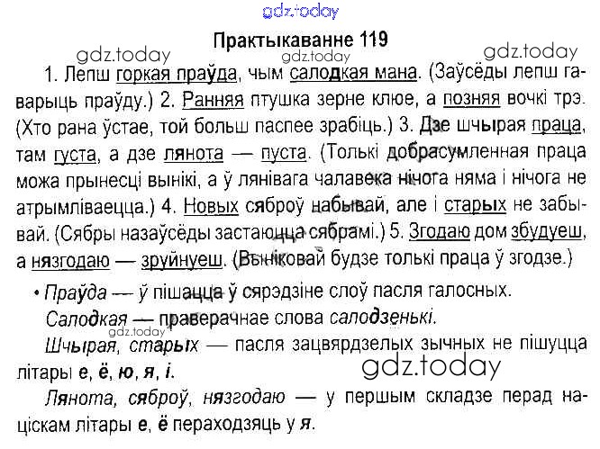 На страницах сайта gdz.today вы найдете учебный и вспомогательный материал, направленный на улучшения знаний школьной программы. ГДЗ - онлайн мир знаний Рашальнік да часткі 2. Практыкаванні 119 Учебнику по Белорусскому языку для 5 класса Красней, Несцяровіч Национальный институт образования 2014