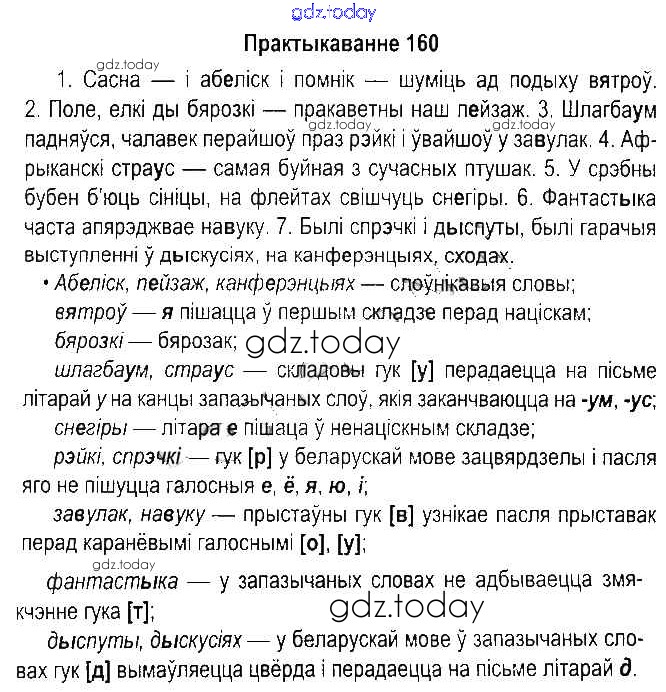 На страницах сайта gdz.today вы найдете учебный и вспомогательный материал, направленный на улучшения знаний школьной программы. ГДЗ - онлайн мир знаний Рашальнік да часткі 2. Практыкаванні 160 Учебнику по Белорусскому языку для 5 класса Красней, Несцяровіч Национальный институт образования 2014