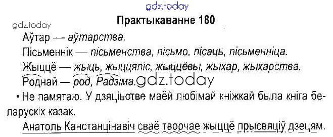 На страницах сайта gdz.today вы найдете учебный и вспомогательный материал, направленный на улучшения знаний школьной программы. ГДЗ - онлайн мир знаний Рашальнік да часткі 2. Практыкаванні 180 Учебнику по Белорусскому языку для 5 класса Красней, Несцяровіч Национальный институт образования 2014