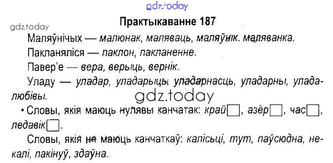 На страницах сайта gdz.today вы найдете учебный и вспомогательный материал, направленный на улучшения знаний школьной программы. ГДЗ - онлайн мир знаний Рашальнік да часткі 2. Практыкаванні 187 Учебнику по Белорусскому языку для 5 класса Красней, Несцяровіч Национальный институт образования 2014