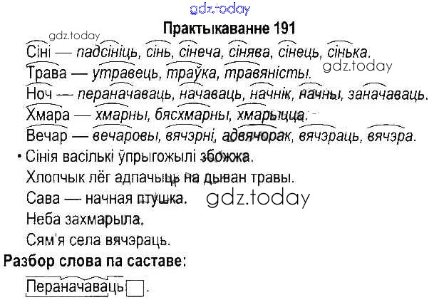 На страницах сайта gdz.today вы найдете учебный и вспомогательный материал, направленный на улучшения знаний школьной программы. ГДЗ - онлайн мир знаний Рашальнік да часткі 2. Практыкаванні 191 Учебнику по Белорусскому языку для 5 класса Красней, Несцяровіч Национальный институт образования 2014