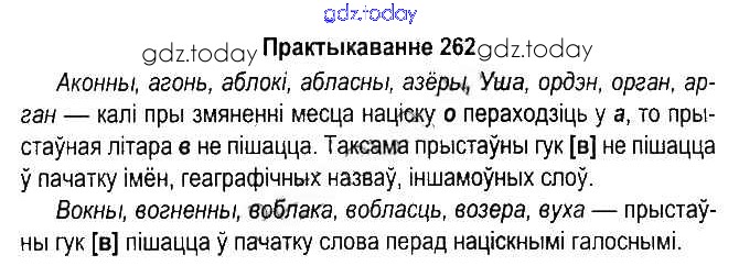 На страницах сайта gdz.today вы найдете учебный и вспомогательный материал, направленный на улучшения знаний школьной программы. ГДЗ - онлайн мир знаний Рашальнік да часткі 2. Практыкаванні 262 Учебнику по Белорусскому языку для 5 класса Красней, Несцяровіч Национальный институт образования 2014