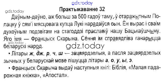 На страницах сайта gdz.today вы найдете учебный и вспомогательный материал, направленный на улучшения знаний школьной программы. ГДЗ - онлайн мир знаний Рашальнік да часткі 2. Практыкаванні 32 Учебнику по Белорусскому языку для 5 класса Красней, Несцяровіч Национальный институт образования 2014