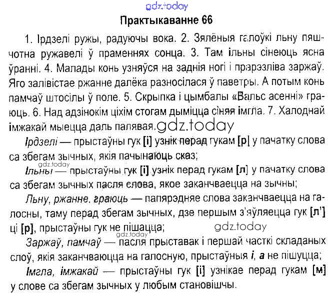 На страницах сайта gdz.today вы найдете учебный и вспомогательный материал, направленный на улучшения знаний школьной программы. ГДЗ - онлайн мир знаний Рашальнік да часткі 2. Практыкаванні 66 Учебнику по Белорусскому языку для 5 класса Красней, Несцяровіч Национальный институт образования 2014