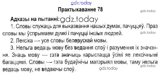 На страницах сайта gdz.today вы найдете учебный и вспомогательный материал, направленный на улучшения знаний школьной программы. ГДЗ - онлайн мир знаний Рашальнік да часткі 2. Практыкаванні 78 Учебнику по Белорусскому языку для 5 класса Красней, Несцяровіч Национальный институт образования 2014